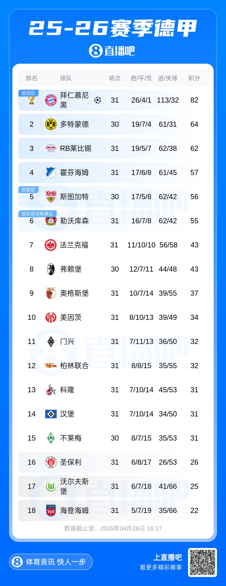 04月26日讯 德甲第31轮,沃尔夫斯堡0-0战平门兴,近14轮联赛仅取得一场胜利,继续排名德甲倒数第二。